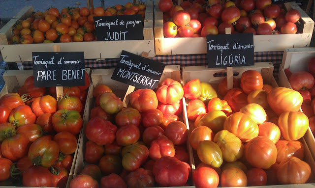 Si me quedo corta, los compro. Pero no en el super de la esquina, ese que ofrece 2 kgs por 1€. Me acerco a mi mercado, y voy directamente a los payeses que venden sus productos. Ellos son los guardianes de ese preciado tesoro que son las variedades antiguas de tomates.